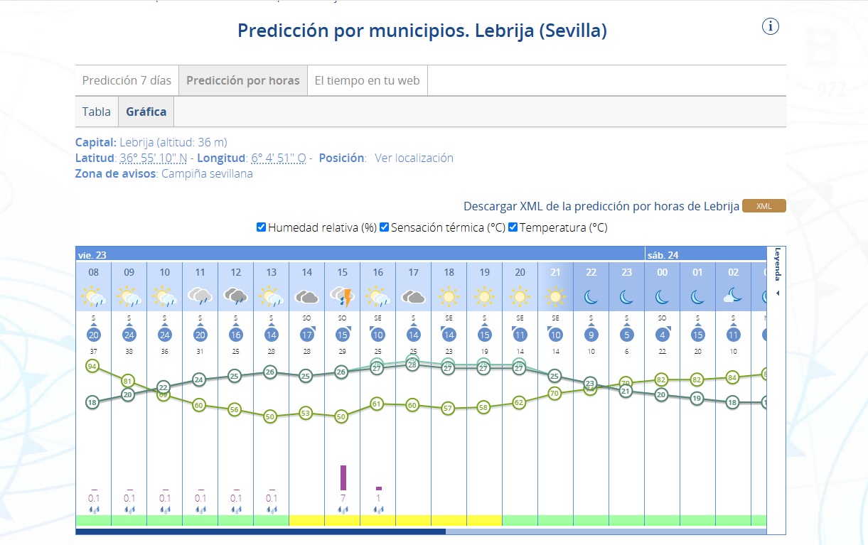 La Agencia Estatal de Meteorología – AEMET – ha anunciado para viernes, 23 de mayo, una nueva jornada de precipitaciones en Lebrija, estableciéndose así nivel amarillo en la campiña sevillana desde las 14:00 a las 20:00 horas por la previsión de tormentas.