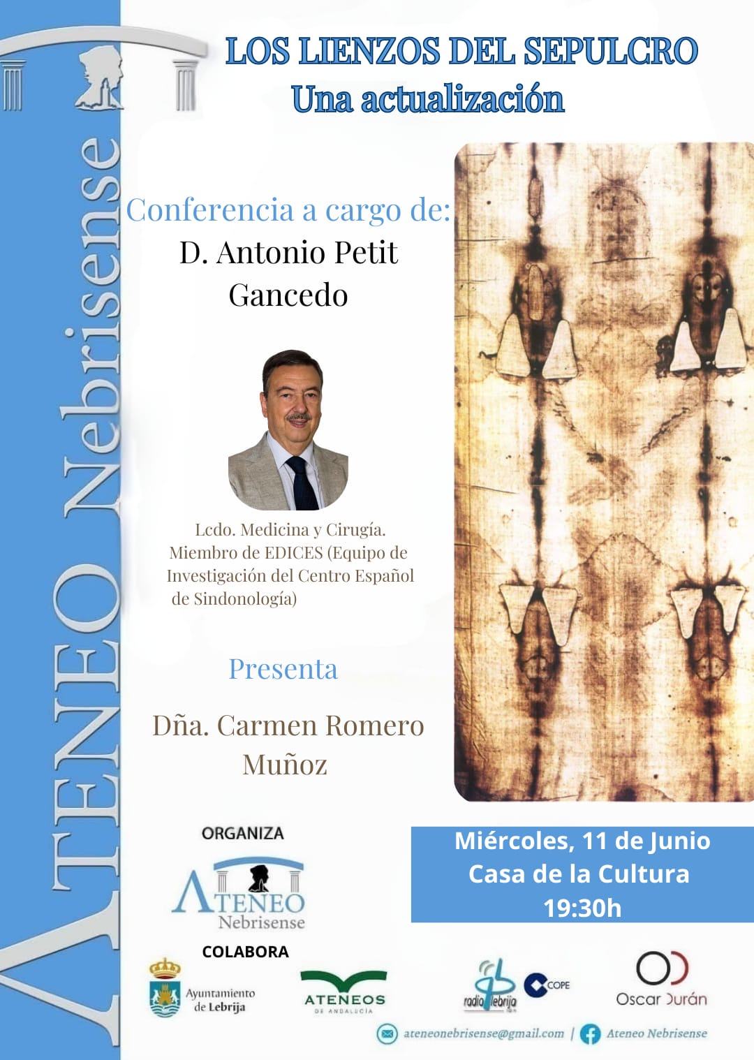El Ateneo Nebrisense anuncia la nueva fecha para la conferencia "Los lienzos del Sepulcro. Una Actualización", que correrá a cargo del prestigioso Dr. Antonio Petit Gancedo. El acto tendrá lugar el próximo miércoles 11 de junio, a las 19:30 horas, en la Casa de la Cultura de Lebrija.