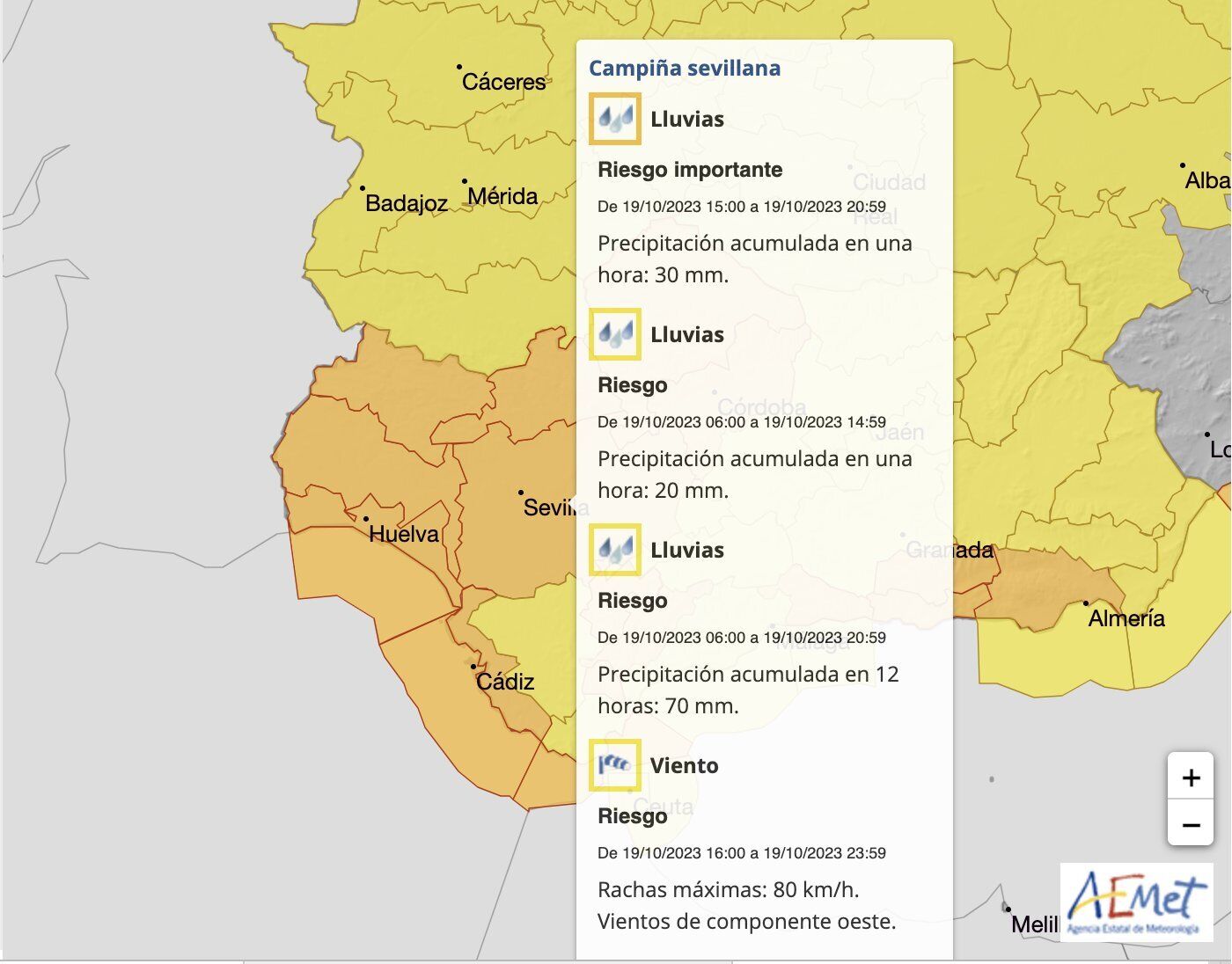 La Agencia Estatal de Meteorología – AEMET – ha anunciado para este jueves, 19 de octubre, una jornada de lluvias y fuertes rachas de viento en la provincia de Sevilla que podrían alcanzar los 80 kilómetros hora. Por este motivo ha activado avisos nivel naranja (franja horaria de 15:00 a 21:00 horas) y amarillo (hasta las 15:00 horas) en nuestra comarca.