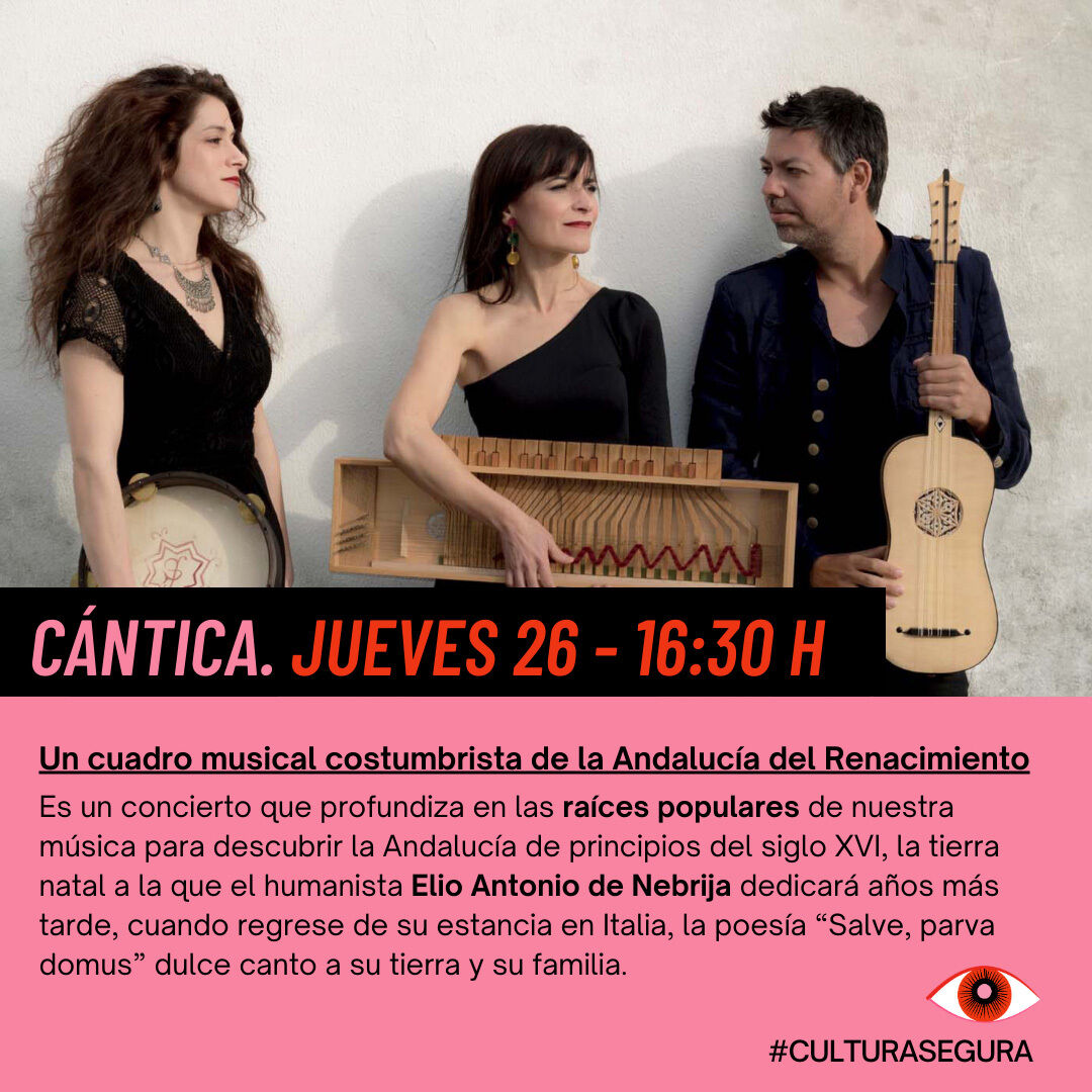 Cántica ofrecerá “Un cuadro musical costumbrista de la Andalucía del Renacimiento”. Comenzará a las 16:30 h., en cumplimiento de las medidas frente a la Covid-19