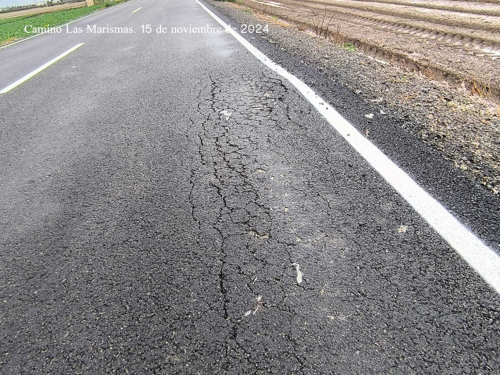 A pesar de la inversión realizada en el citado camino rural superior a los 326.000 euros, el mismo presenta importantes desperfectos en el firme que pueden suponer riesgos para la seguridad vial. Están apareciendo baches y socavones considerables en diferentes tramos de los más de 2,2 kilómetros de esta vía que conecta la A-8150 con la carretera de las casas bombas del Subsector B, principal acceso del tráfico rodado a la Cooperativa Las Marismas.