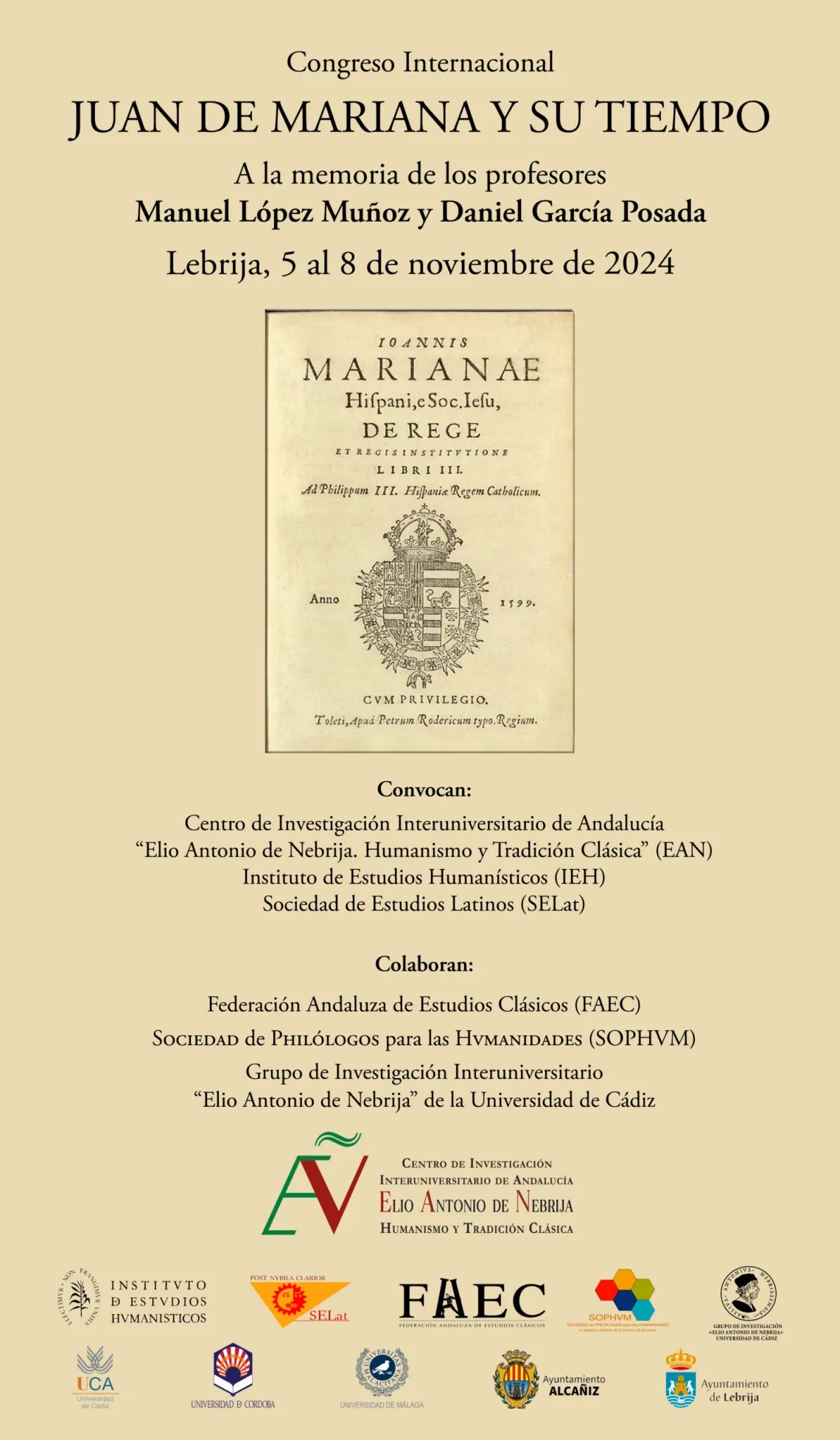 El evento, convocado conjuntamente entre el EAN, la Sociedad de Estudios Latinos de España y el Instituto de Estudios Humanísticos, contará con la colaboración de la Federación Andaluza de Estudios Clásicos (FAEC), la sociedad de Philologos para las Humanidades (SOPHUM), el Ayuntamiento de Lebrija y el grupo de Investigación Interuniversitario “Elio Antonio de Nebrija” de la Universidad de Cádiz.