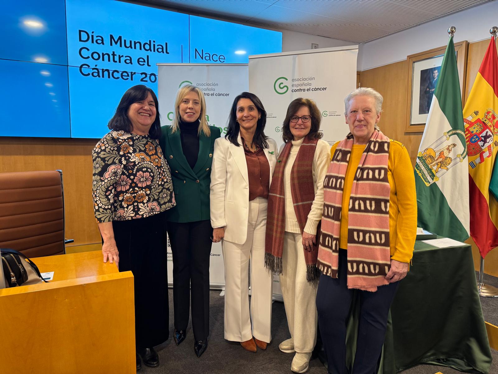 Una representación de la Junta Local de la Asociación Española contra el Cáncer y la delegada de Salud, María Ángeles Mena han participado en el acto organizado conjuntamente por la Asociación Española Contra el Cáncer y la Diputación de Sevilla con motivo del Día Mundial Contra el Cáncer.