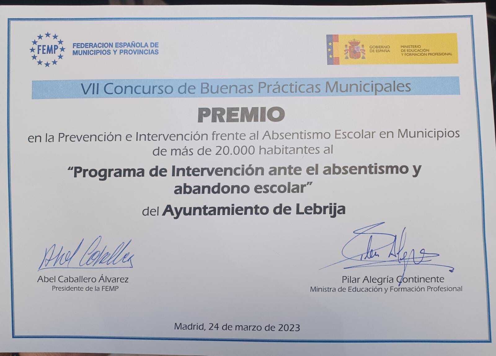 Lebrija recibe un premio de buenas prácticas municipales por el Programa de intervención ante el Absentismo y abandono Escolar