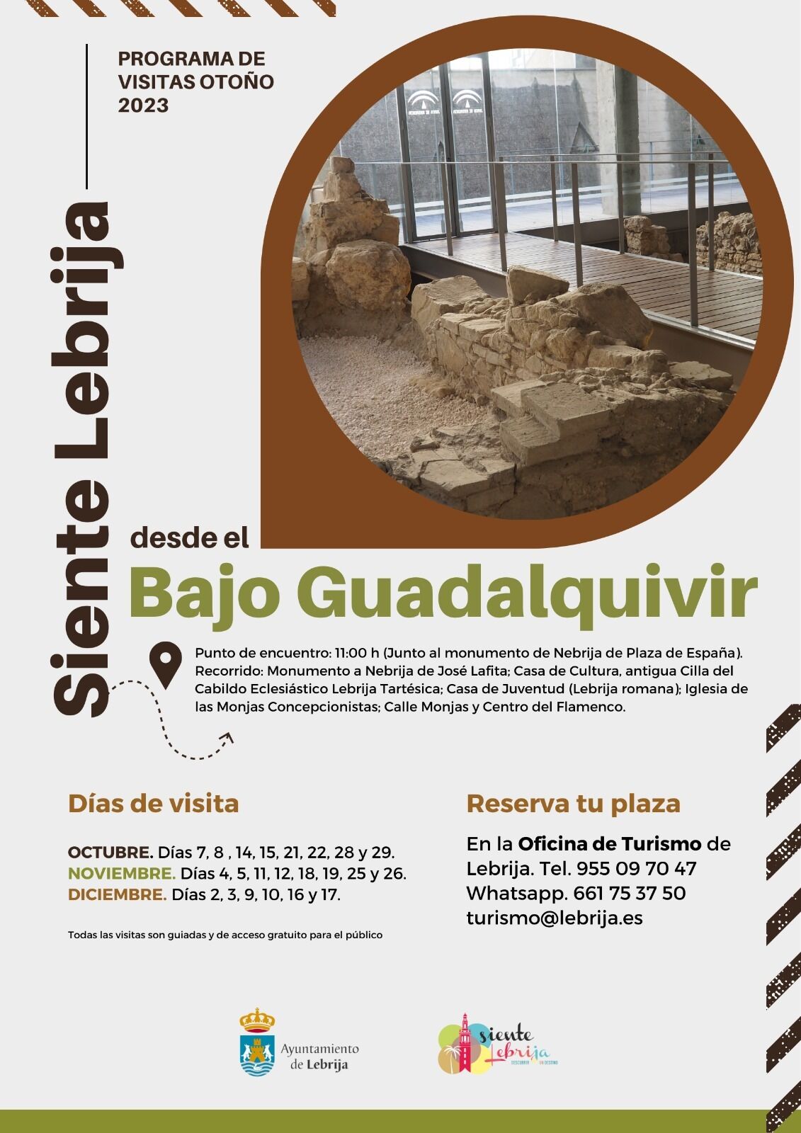 El recorrido de cada visita cultural será el siguiente: Salida a las 11:00 horas desde la Plaza de España visitando los siguientes puntos: Monumento a Elio Antonio de Nebrija (Plaza de España); Casa de la Cultura, antigua Cilla del Cabildo Eclesiástico; Sala Expositiva Lebrija Tartésica; Casa de la Juventud (Lebrija Romana – app Siente Lebrija); Iglesia de las Monjas Concepcionistas; calle de las Monjas; y visita al Centro del Flamenco de Lebrija.