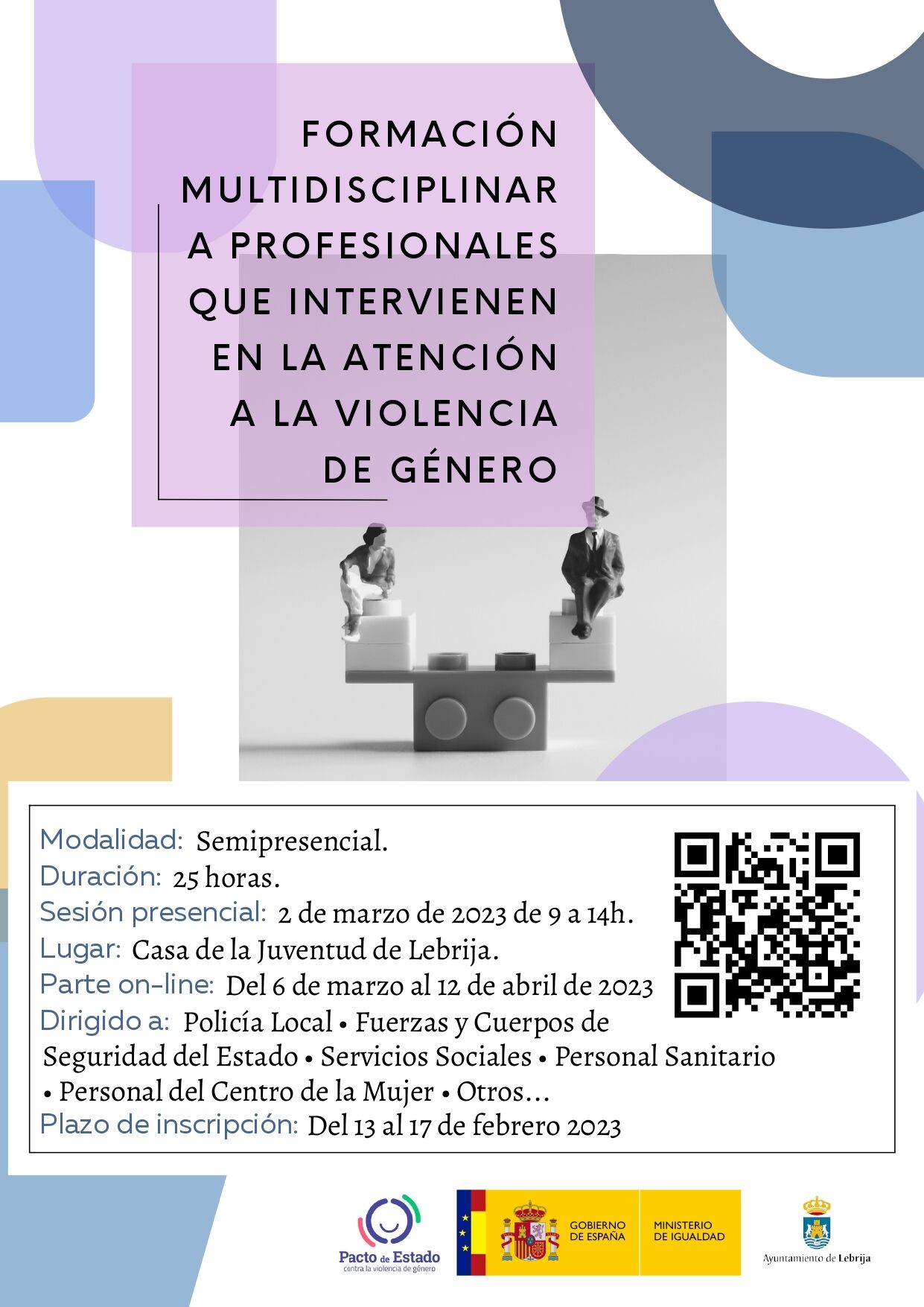 En concreto se trata de una formación multidisciplinar de 25 horas con el objetivo de formar a profesionales para mejorar la atención, protección y acompañamiento de las mujeres víctimas de violencia de género de Lebrija. El plazo de inscripción será del lunes 13 al viernes 17 de febrero de 2023.
