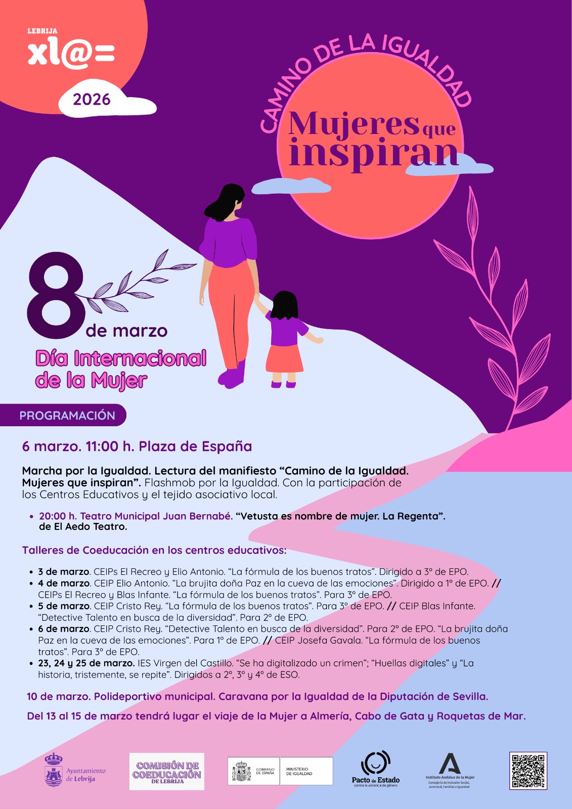 Con motivo del Día Internacional de la Mujer, que se celebra el próximo 8 de marzo a nivel mundial, el Ayuntamiento de Lebrija, junto con la Comisión de Coeducación y toda la comunidad educativa, organiza una serie de actividades bajo la campaña “Camino de la igualdad. Mujeres que inspiran”, con el objetivo de visibilizar las desigualdades de género, educar en valores y reivindicar la igualdad real entre hombres y mujeres.