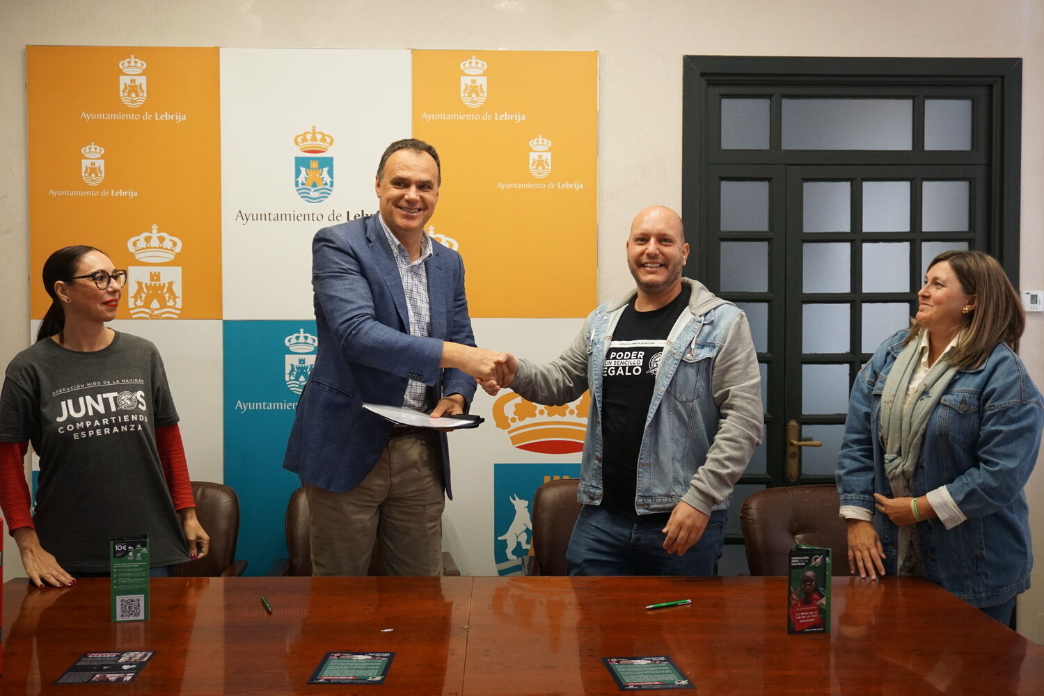 En la mañana de hoy, en la alcaldía del Ayuntamiento de Lebrija, el alcalde de la ciudad, Pepe Barroso, y el presidente del colectivo lebrijano, Marcos Silva, han firmado del convenio de colaboración entre ambas entidades. En el acto también han estado presentes la delegada de Bienestar Social, Teresa Serrano, y Laura Mateo, vocal de la entidad.