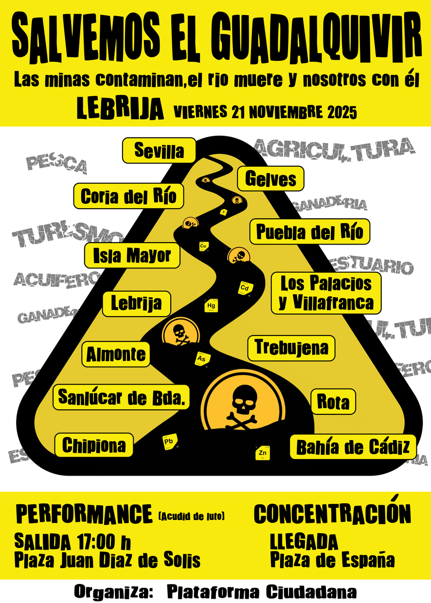 Asociaciones ciudadanas se darán cita el viernes 21 de noviembre de 2025 a las 17 horas en la plaza de Juan Díaz de Solís para participar en una acción artística reivindicativa que pretende visibilizar e informar de la grave amenaza al Estuario del Guadalquivir por los vertidos mineros provenientes de la reapertura de las minas de Aznalcóllar y Cobre las Cruces.