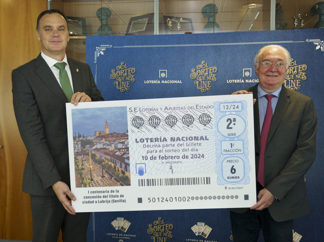 El presidente de Loterías y Apuestas del Estado, Jesús Huerta, y el alcalde de Lebrija, José Benito Barroso, han presentado hoy el décimo del sábado 10 de febrero, dedicado al I Centenario de la concesión del título de ciudad a Lebrija.
