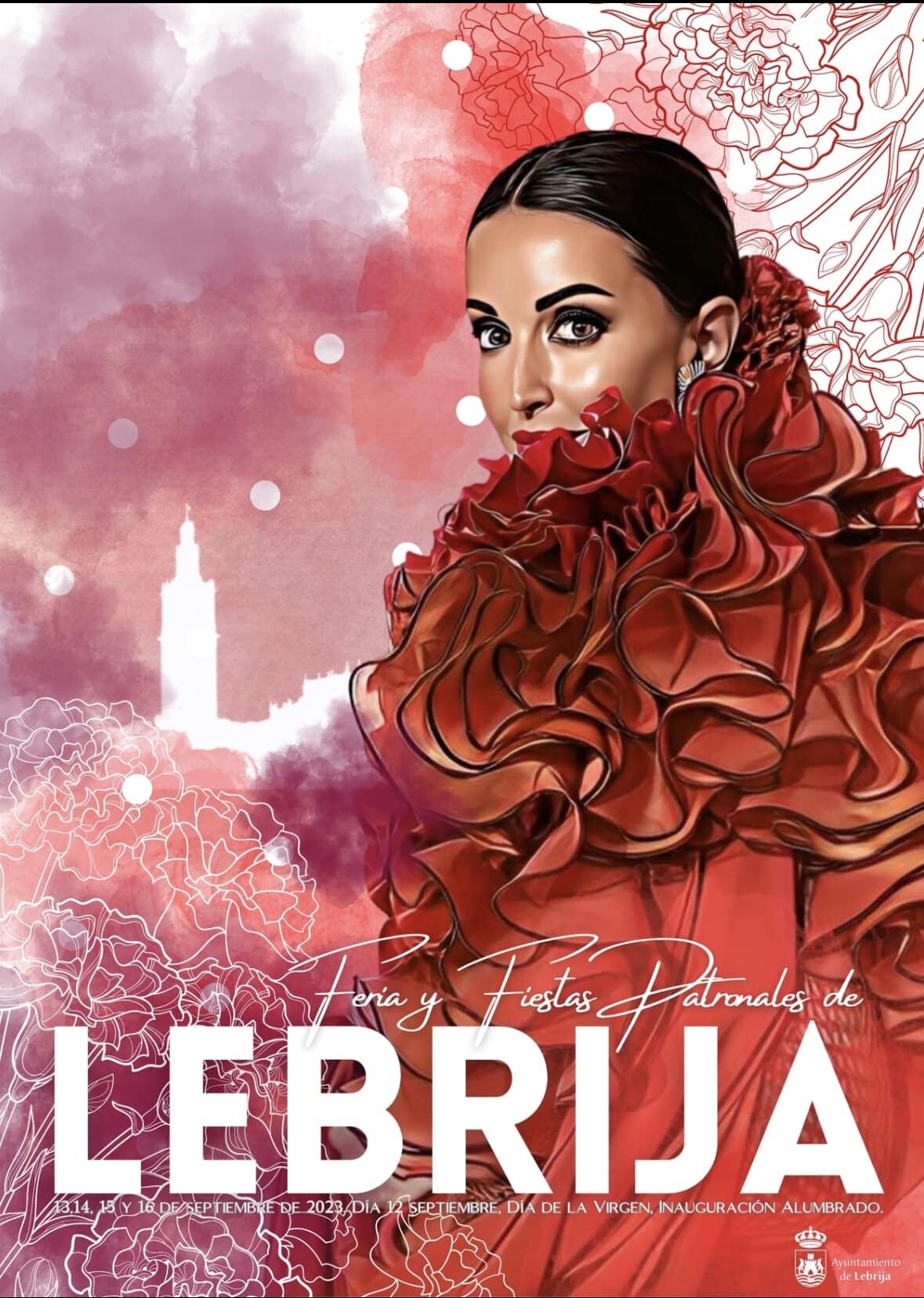 Entre los elementos a destacar en el cartel y su significado, están los lunares, estampado primordial en la moda flamenca y que aquí representan lo flamenco y lo gitano, por la convivencia ejemplar, que de ambas culturas hay en nuestra localidad desde siempre. Las esquinas se llenan de claveles, en reconocimiento a la labor que en las marismas de Lebrija se hace con el cultivo de la flor cortada, pero que pretende ser un homenaje a todos los que trabajan en el principal motor de la economía lebrijana, la agricultura. Sobre un fondo de acuarela aparece el perfil blanco de la Giraldilla, como un lienzo dispuesto a acoger todos los colores en libertad y armonía.