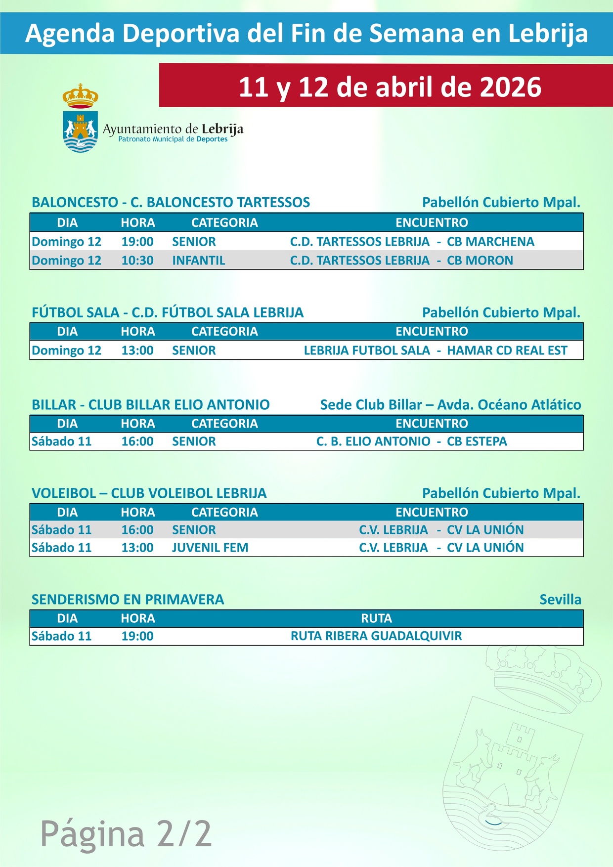 El Ayuntamiento de Lebrija, a través del Patronato Municipal de Deportes, ha dado a conocer la programación deportiva para el fin de semana del 11 y 12 de abril de 2026.