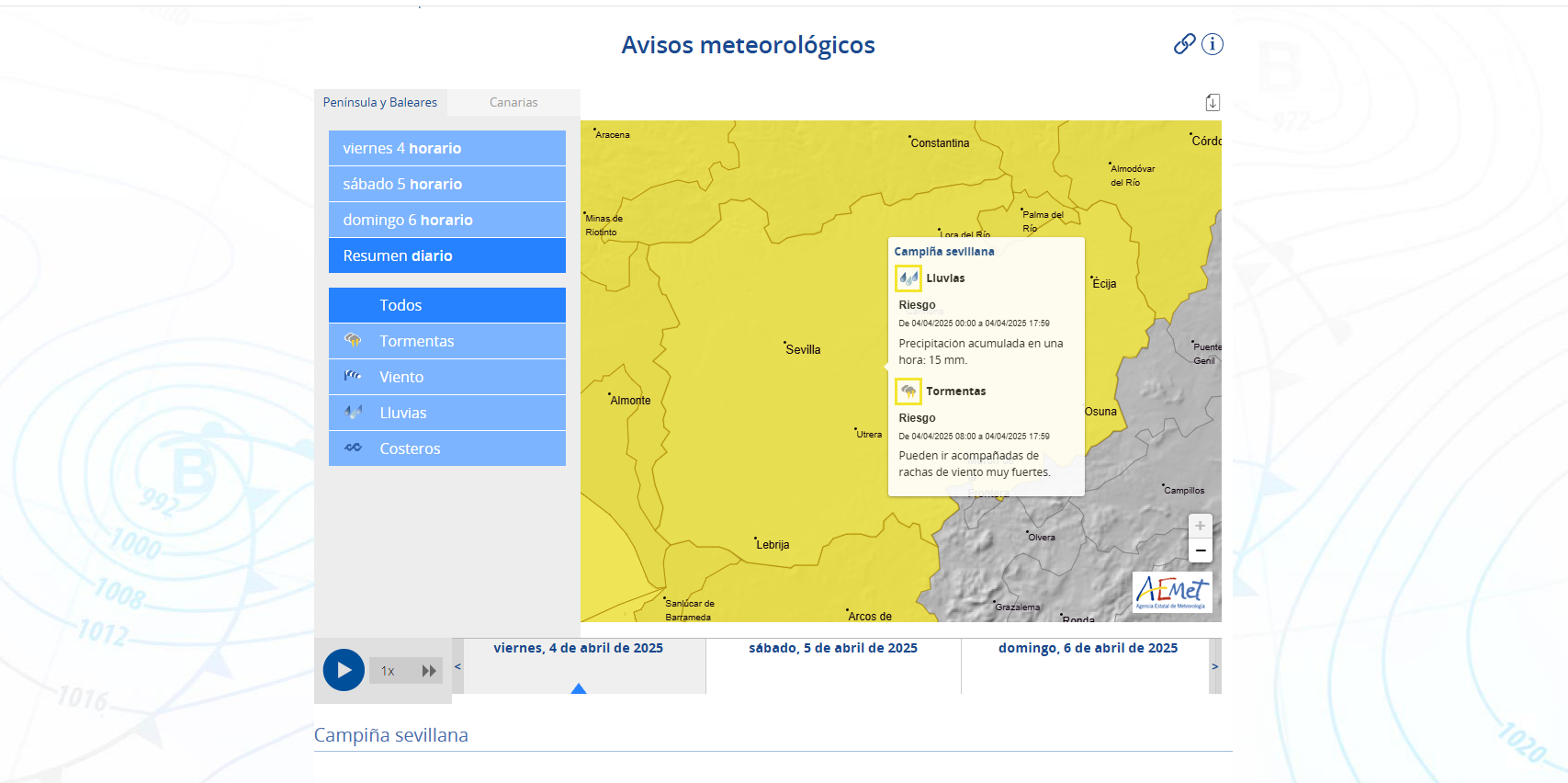 La Agencia Estatal de Meteorología – AEMET – ha anunciado para viernes, 4 de abril, una nueva jornada de lluvias y aviso de rachas de viento muy fuertes, estableciéndose así nivel amarillo en la campiña sevillana hasta las 17:59 horas.