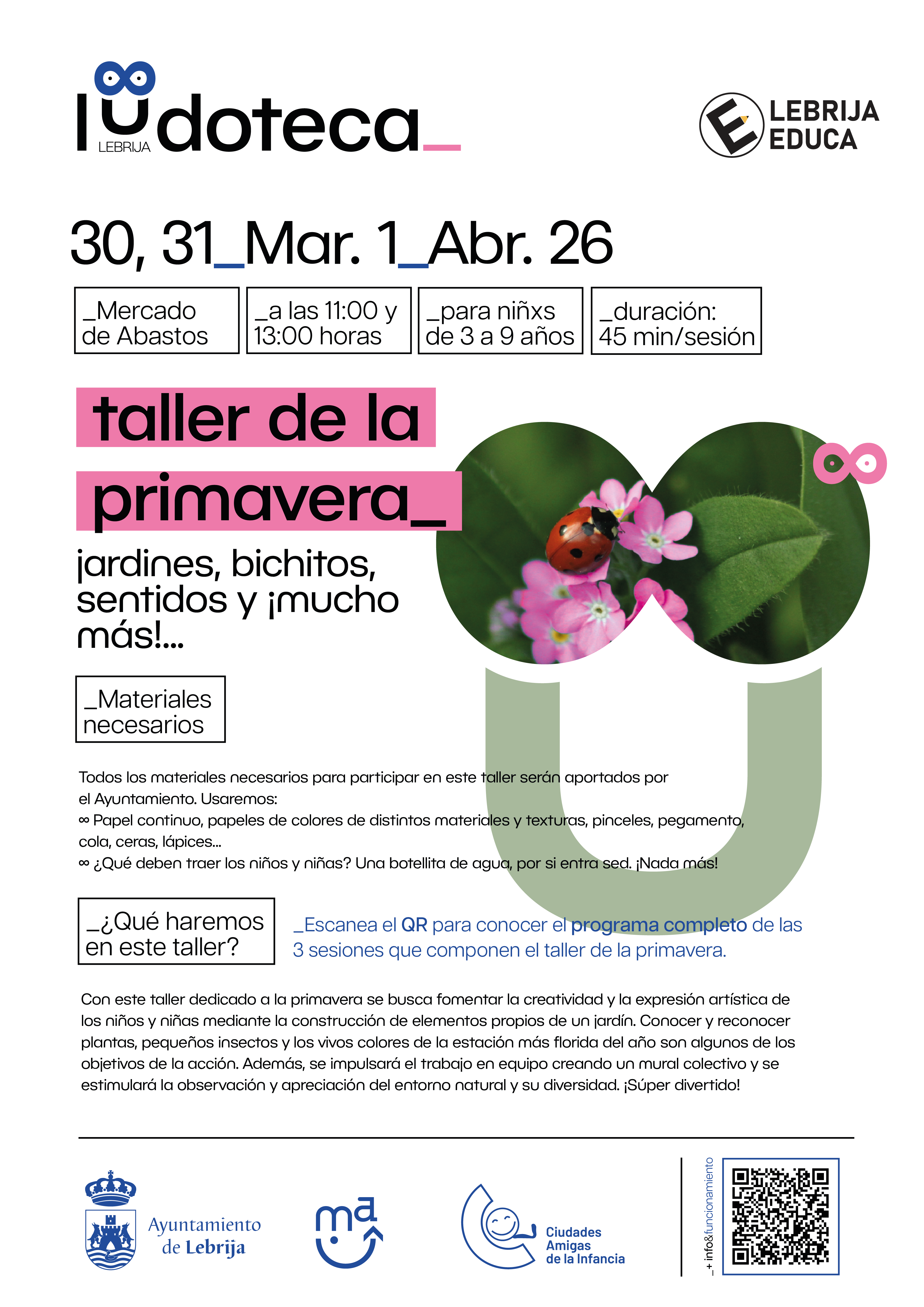 Entre las primeras actividades programadas destaca el “Taller de Primavera”, que se celebrará en varias sesiones a lo largo de finales de marzo y principios de abril. Este taller, de carácter creativo y participativo, tiene como objetivo fomentar la expresión artística, el trabajo en equipo y el conocimiento del entorno natural a través de la creación de un mural colectivo inspirado en la estación primaveral.