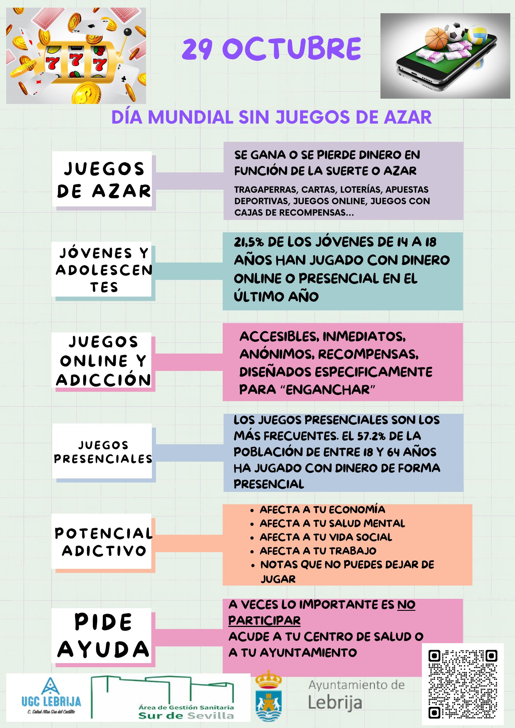 Por ello, desde la delegación de Bienestar Social, a través del programa “Ciudades Ante Las Drogas” conjuntamente con el Centro de Salud “Virgen del Castillo” pone en marcha una campaña de sensibilización con motivo de la celebración, el próximo 29 de Octubre, del Día Sin Juegos de Azar, con la finalidad de ofrecer información sobre este tipo de adicción, prevenir el mal uso y los posibles problemas que se deriven de los juegos de azar.