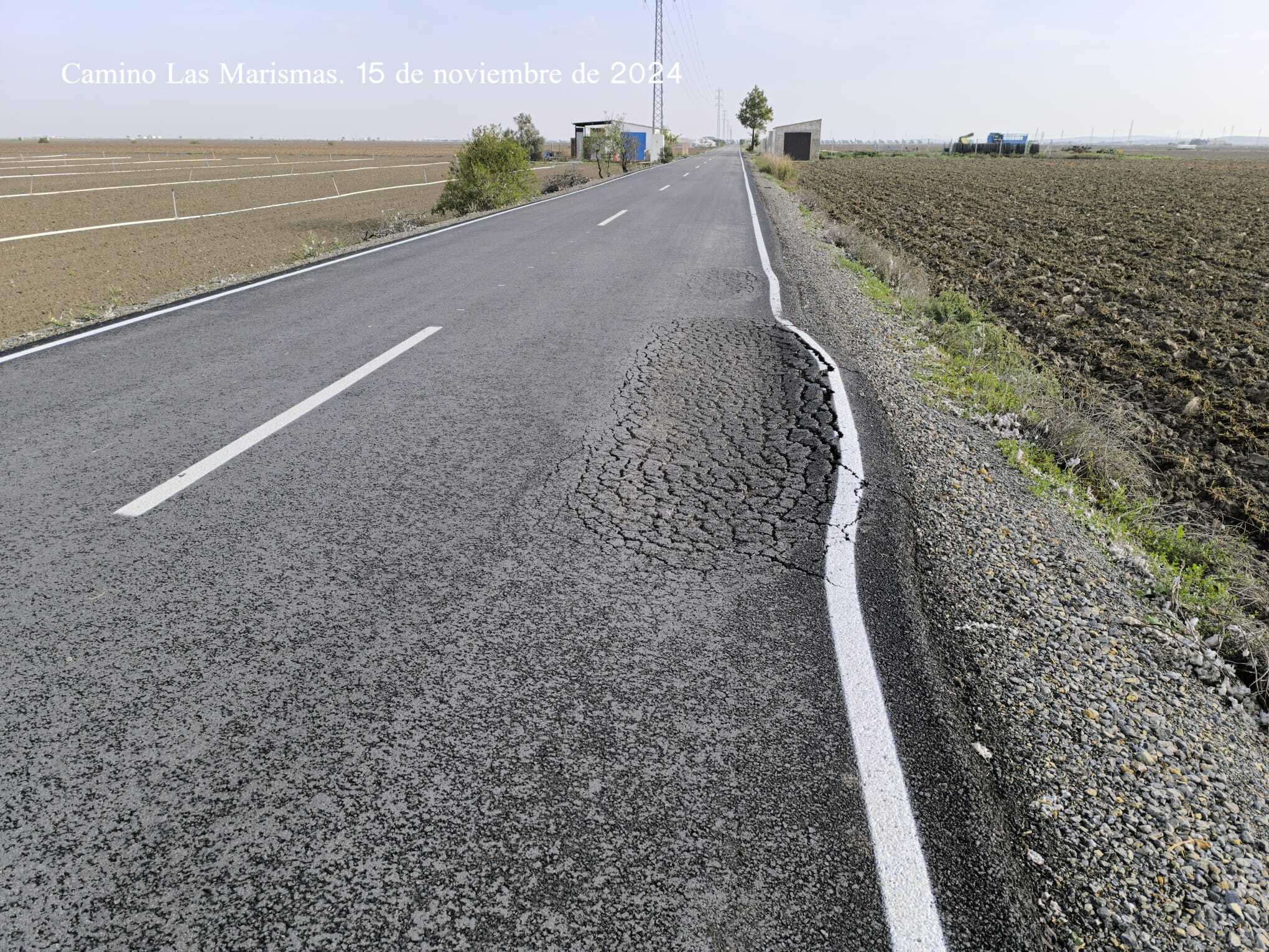 A pesar de la inversión realizada en el citado camino rural superior a los 326.000 euros, el mismo presenta importantes desperfectos en el firme que pueden suponer riesgos para la seguridad vial. Están apareciendo baches y socavones considerables en diferentes tramos de los más de 2,2 kilómetros de esta vía que conecta la A-8150 con la carretera de las casas bombas del Subsector B, principal acceso del tráfico rodado a la Cooperativa Las Marismas.