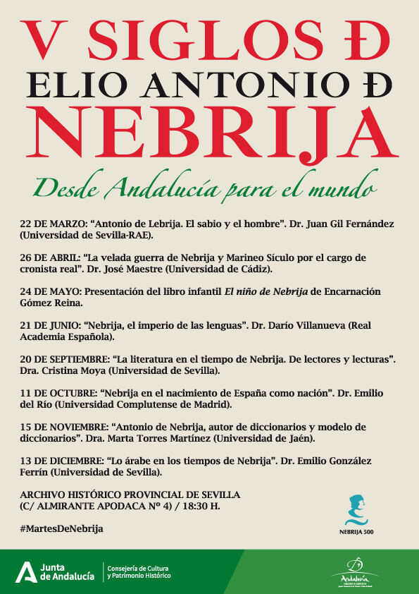 Dentro de las acciones establecidas en el protocolo de colaboración firmado entre el Ayuntamiento de Lebrija y la Consejería de Cultura y Patrimonio Histórico, la Junta continúa con la programación de actividades conmemorativas con motivo del V centenario de la muerte de Elio Antonio de Nebrija.