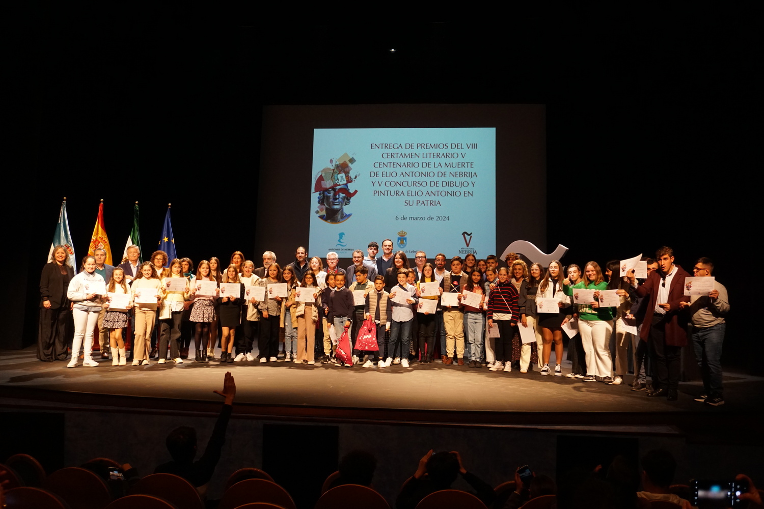 El pasado miércoles, 6 de marzo, el Teatro Municipal Juan Bernabé acogió la entrega de los premios del V concurso de dibujo y pintura "Elio Antonio en su patria" y del VIII certamen literario " VI Centenario Elio Antonio de Nebrija". Un acto que fue presidido por el alcalde de la ciudad, Pepe Barroso, el delegado de Cultura, Pepe Martínez, la delegada de Infancia, Educación y Formación, María Paula García, el responsable organizativo del acto, Jerónimo Pérez y José Antonio Francés, autor de la editorial SM.