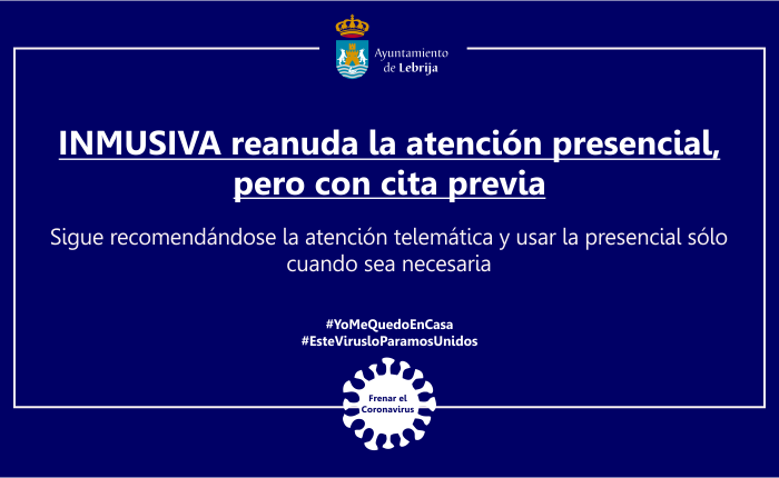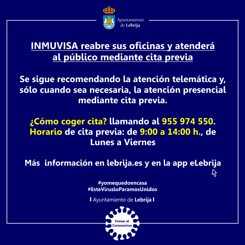 La Empresa Pública Municipal Inmuvisa abrirá a partir de este miércoles, 20 de mayo, sus oficinas ubicadas en la calle Sevilla para atender a los lebrijanos y lebrijanas que requieran solventar un trámite urgente que no pueda ser solucionado de forma telemática.