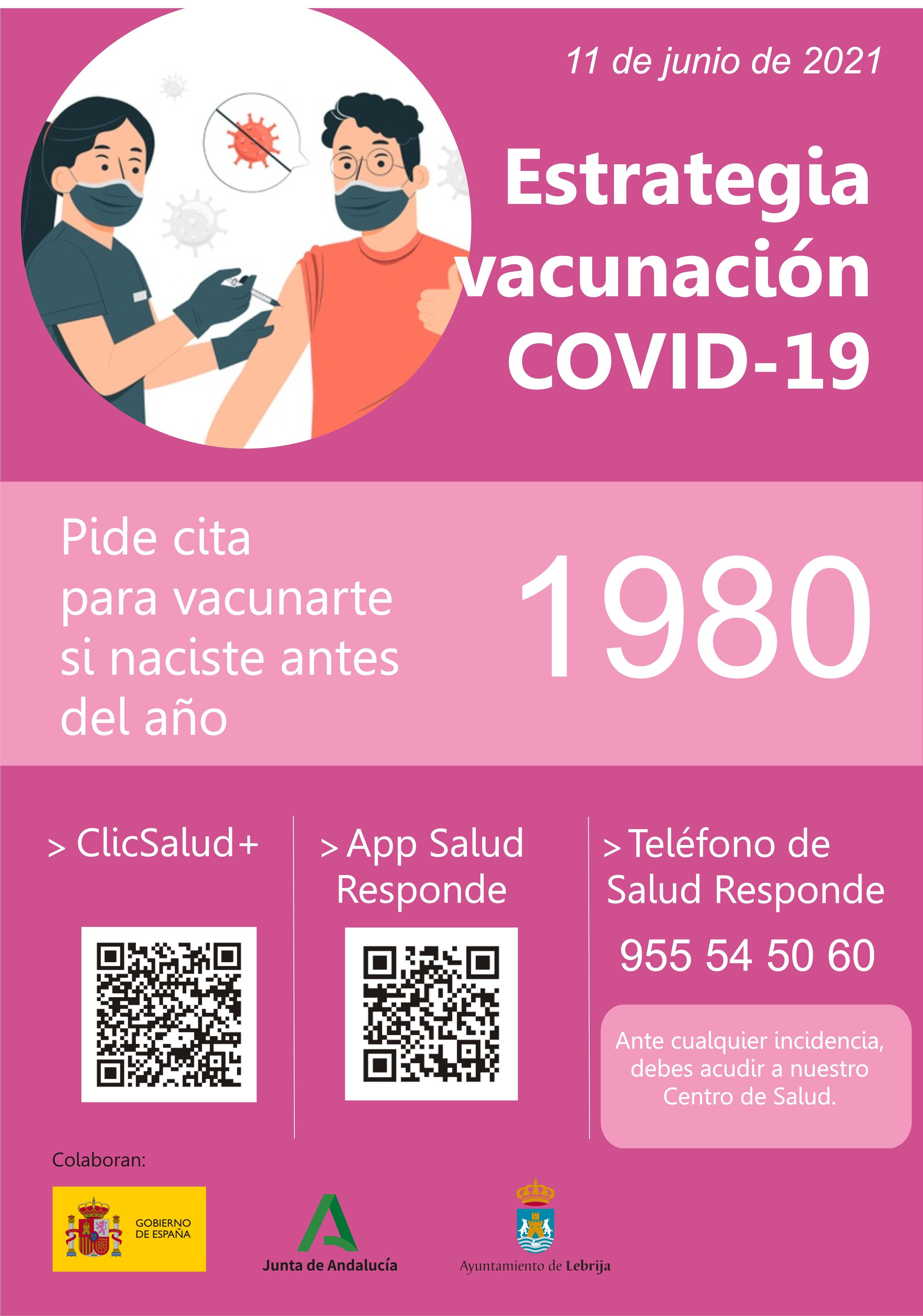Desde el viernes 11 de junio, las personas nacidas en 1979 y 1980 también pueden solicitar cita para la primera dosis de la vacunación COVID-19 a través de ClicSalud+, la App Salud Responde y el teléfono 955 54 50 60 de Salud Responde. Con esta ampliación pueden solicitar cita las personas nacidas en 1980 y años anteriores.