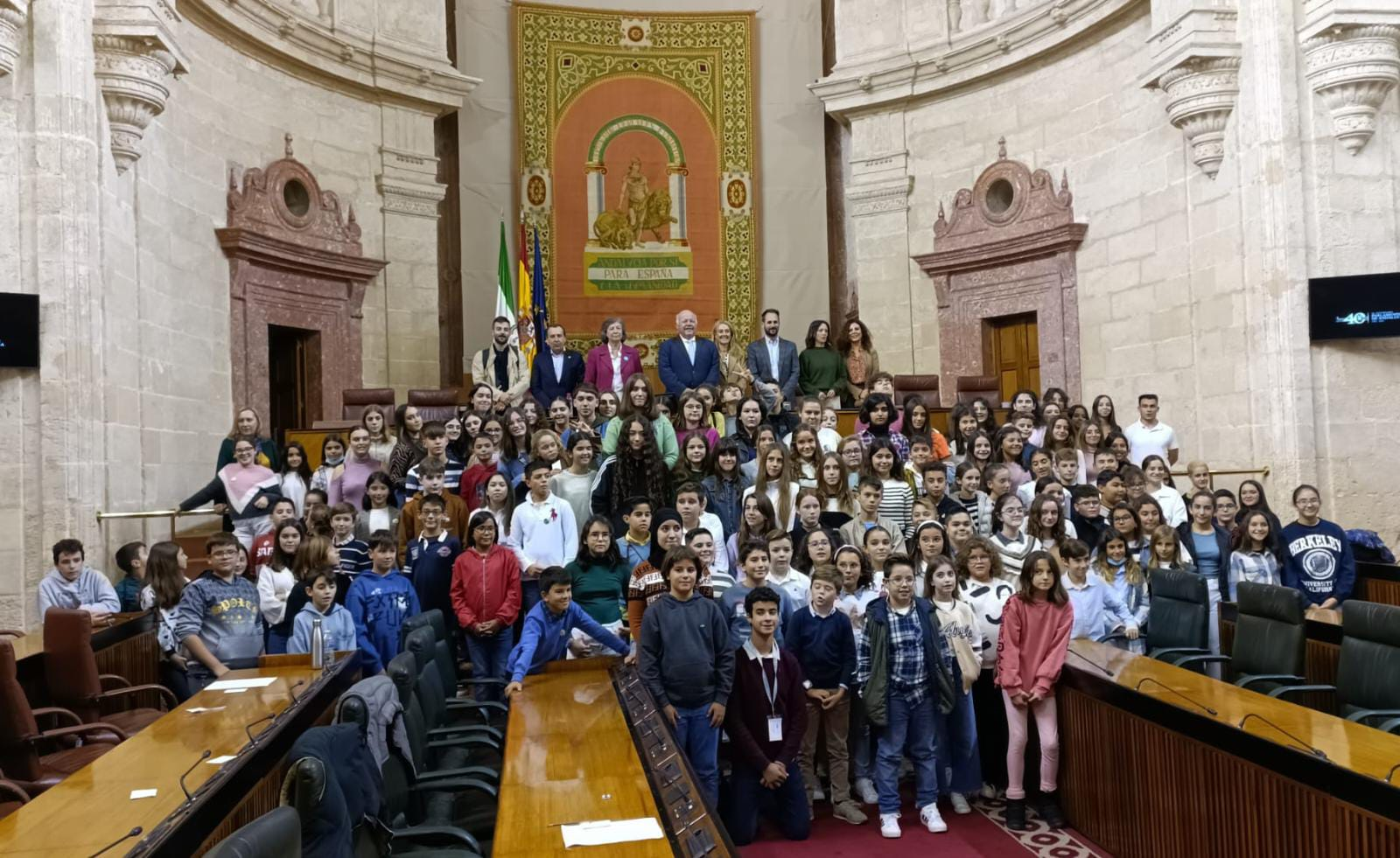 Más de 120 chicos y chicas, de entre 9 y 17 años, pertenecientes a los consejos locales de participación de Lebrija, Barbate, Cártama, Conil de la Frontera, Espejo, Gelves, Huércal de Almería, La Palma del Condado y Loja, tomaron el pasado viernes el mando en la cámara andaluza con motivo del Día Mundial de la Infancia, que se celebra este domingo 20 de noviembre. Al inicio del pleno, fueron recibidos por el presidente del Parlamento, Jesús Aguirre, la presidenta de UNICEF Comité Andalucía, Claudia Zafra, el director general de Infancia, Adolescencia y Juventud, Francisco José Mora y la directora de la Agencia Andaluza de Cooperación Internacional al Desarrollo (AACID), Celia Rosell.