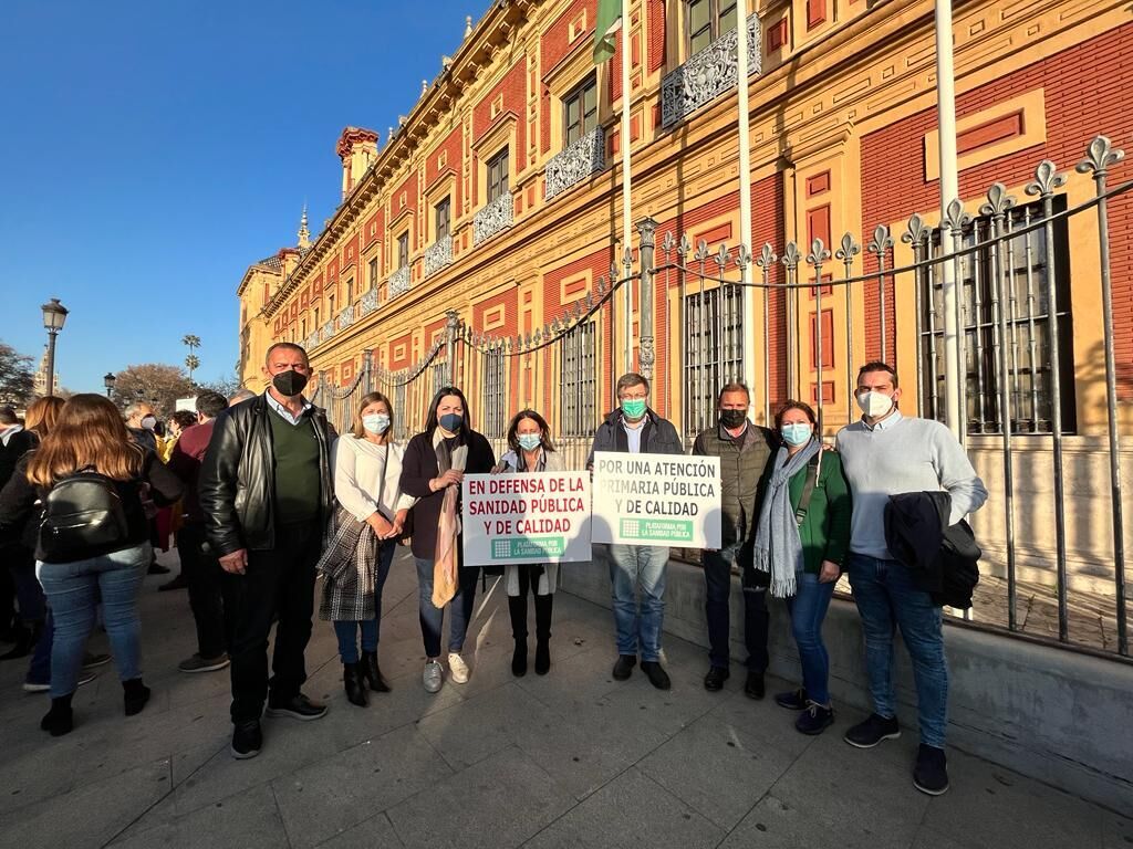 La plataforma de alcaldes y alcaldesas de Sevilla en defensa de la sanidad pública - de la que forma parte el alcalde de Lebrija- se concentró este pasado martes, 8 de febrero, ante el Palacio de San Telmo, sede del Gobierno andaluz, ante la falta de respuesta a la solicitud de reunión que desde la plataforma se hizo al presidente de la Junta de Andalucía.