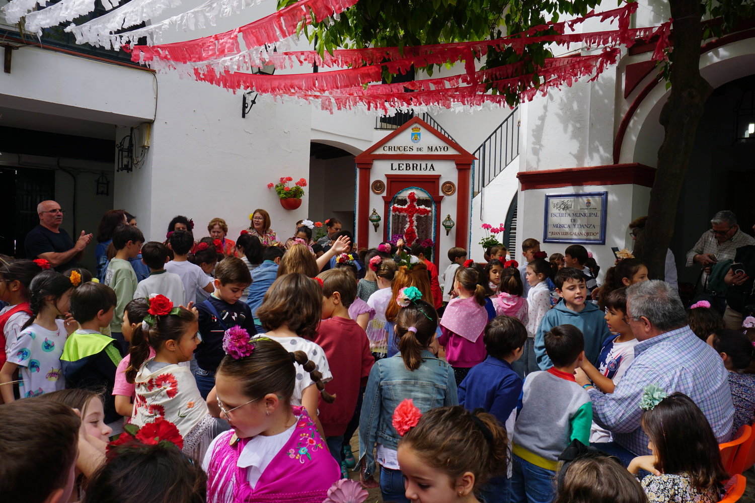 De esta forma, el alumnado de Lebrija participante tiene la oportunidad de vivir in situ el verdadero ambiente de las Cruces de Mayo. En ningún momento falta el cante de las sevillanas corraleras, que permite cantar y bailar a un ataviado alumnado, ya preparados desde casa y los colegios con mantoncillos, flores, cajas de percusión y cañas para marcar el compás.
