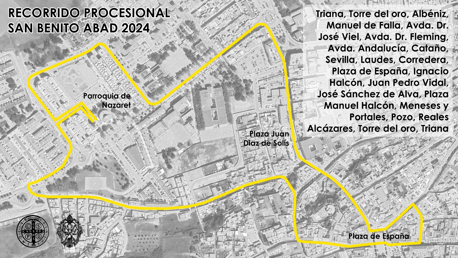 Esta noche, a las 21:30 horas, San Benito iniciará un recorrido procesional por las calles de Lebrija siguiendo el itinerario que se detalla a continuación: